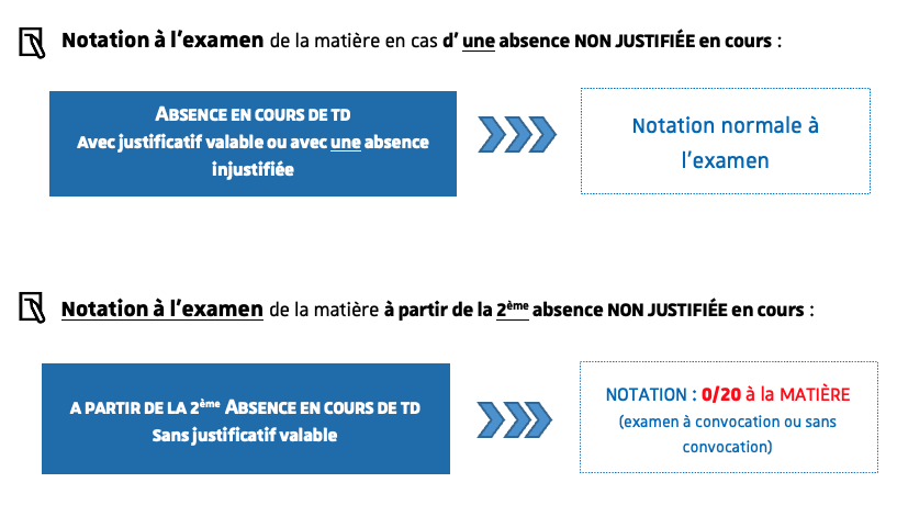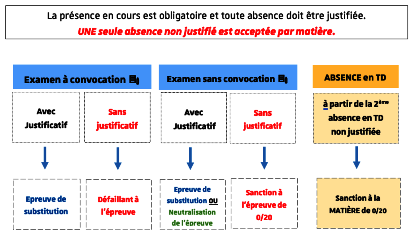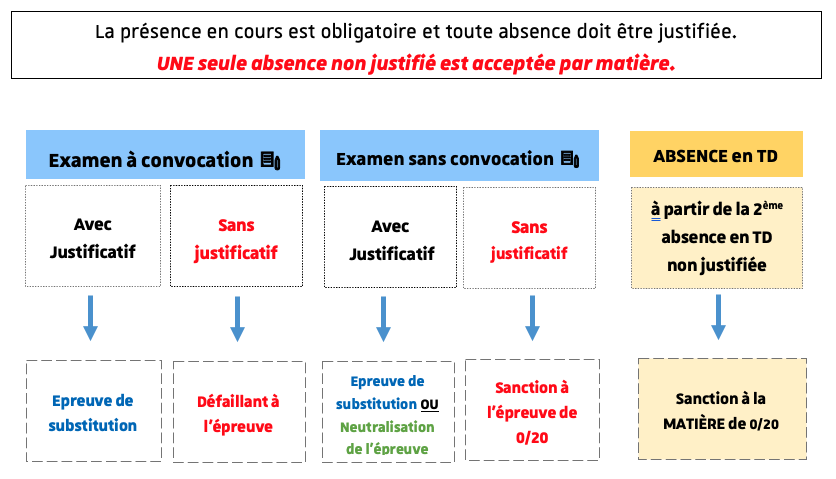 Attention : Lors des évaluations en contrôle continu (CC) ayant lieu pendant les TD, le fait d’avoir un justificatif ou un aménagement d’études avec dispense d’assiduité aux cours, n’implique pas une dispense d’évaluation.